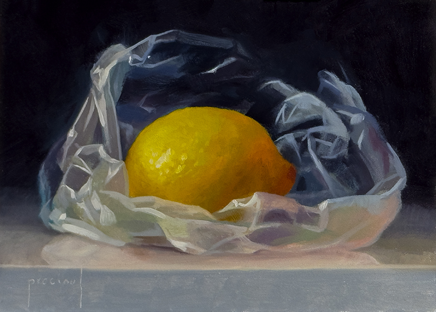 This painting is of a small lemon, still in its grocery bag…. something ordinary, something bright, something present.